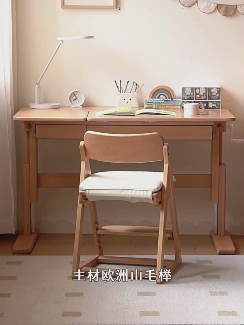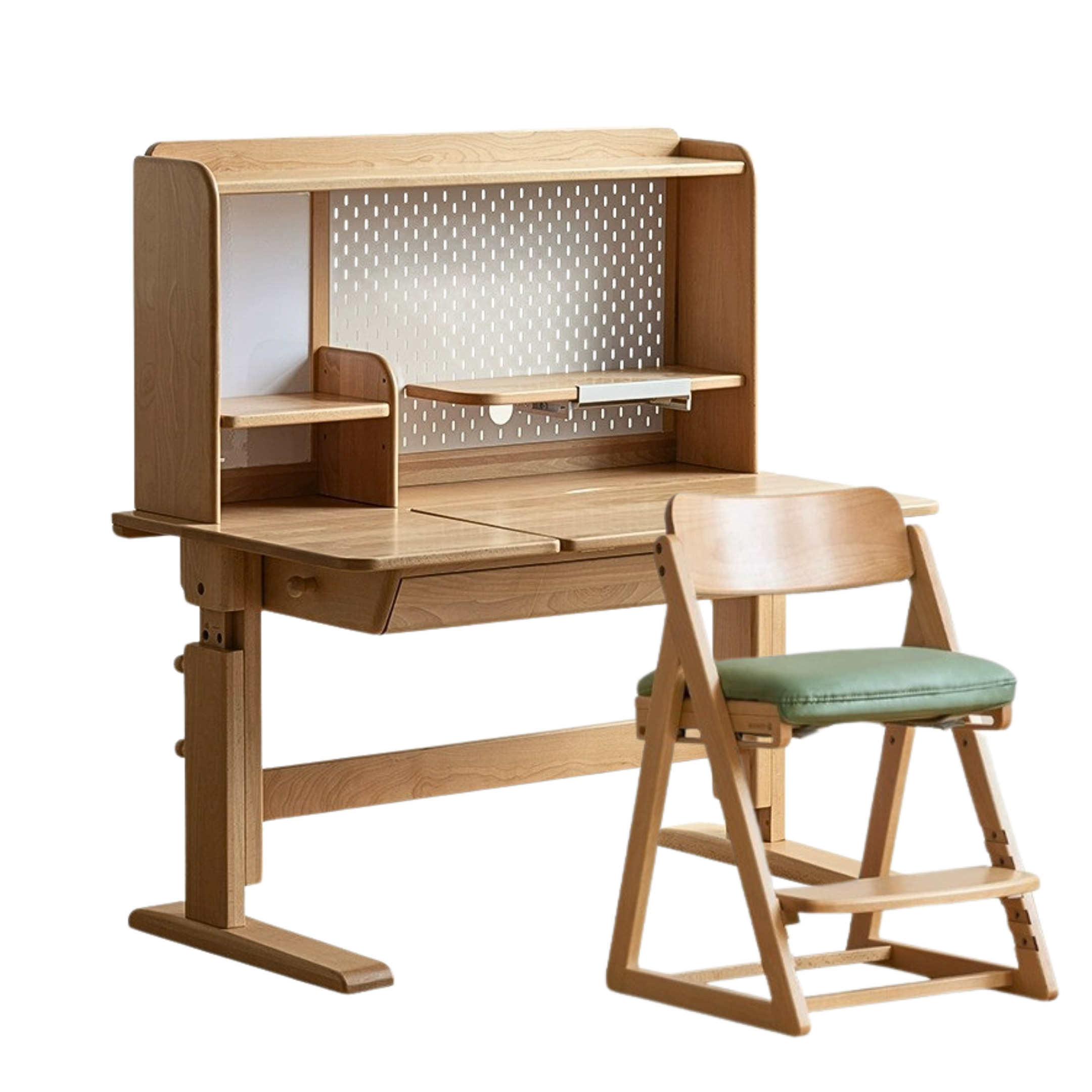 Beech Solid Wood Lifting Kids Table With Self/Chair/High Shelf