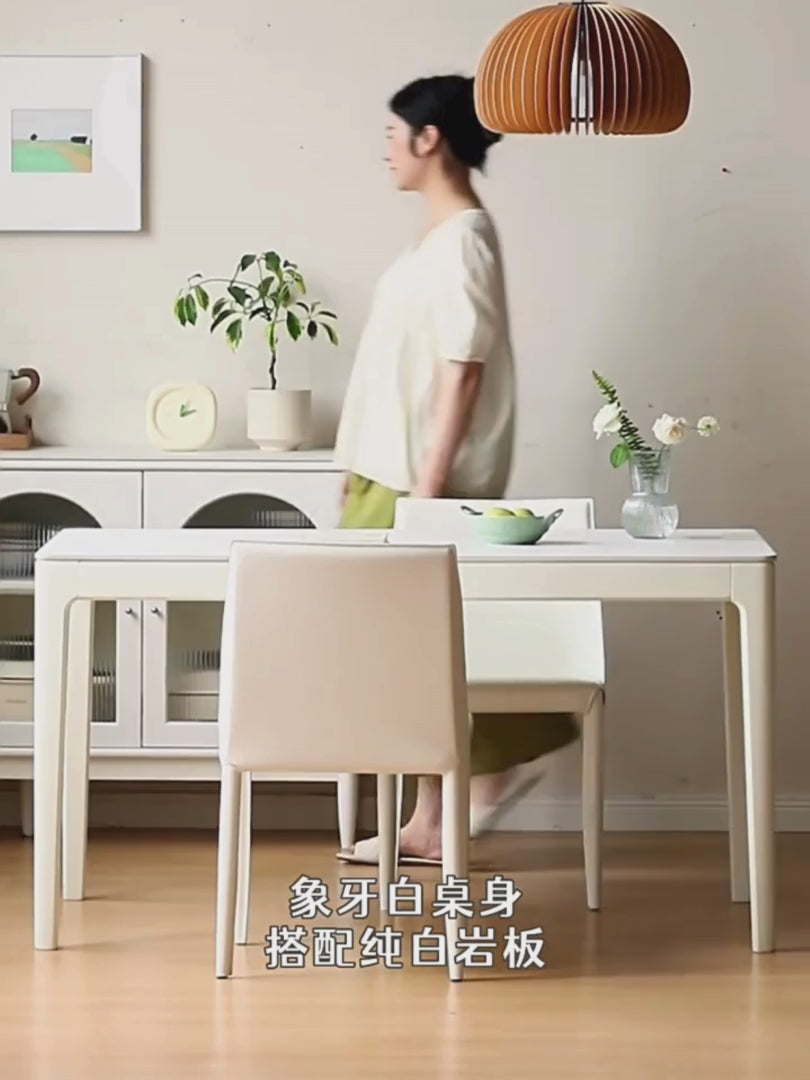The gentle and creamy style rock slab dining table is here~ The pure white table body is matched with the rock slab desktop, which is full of texture and dirt-resistant rock slab desktop.