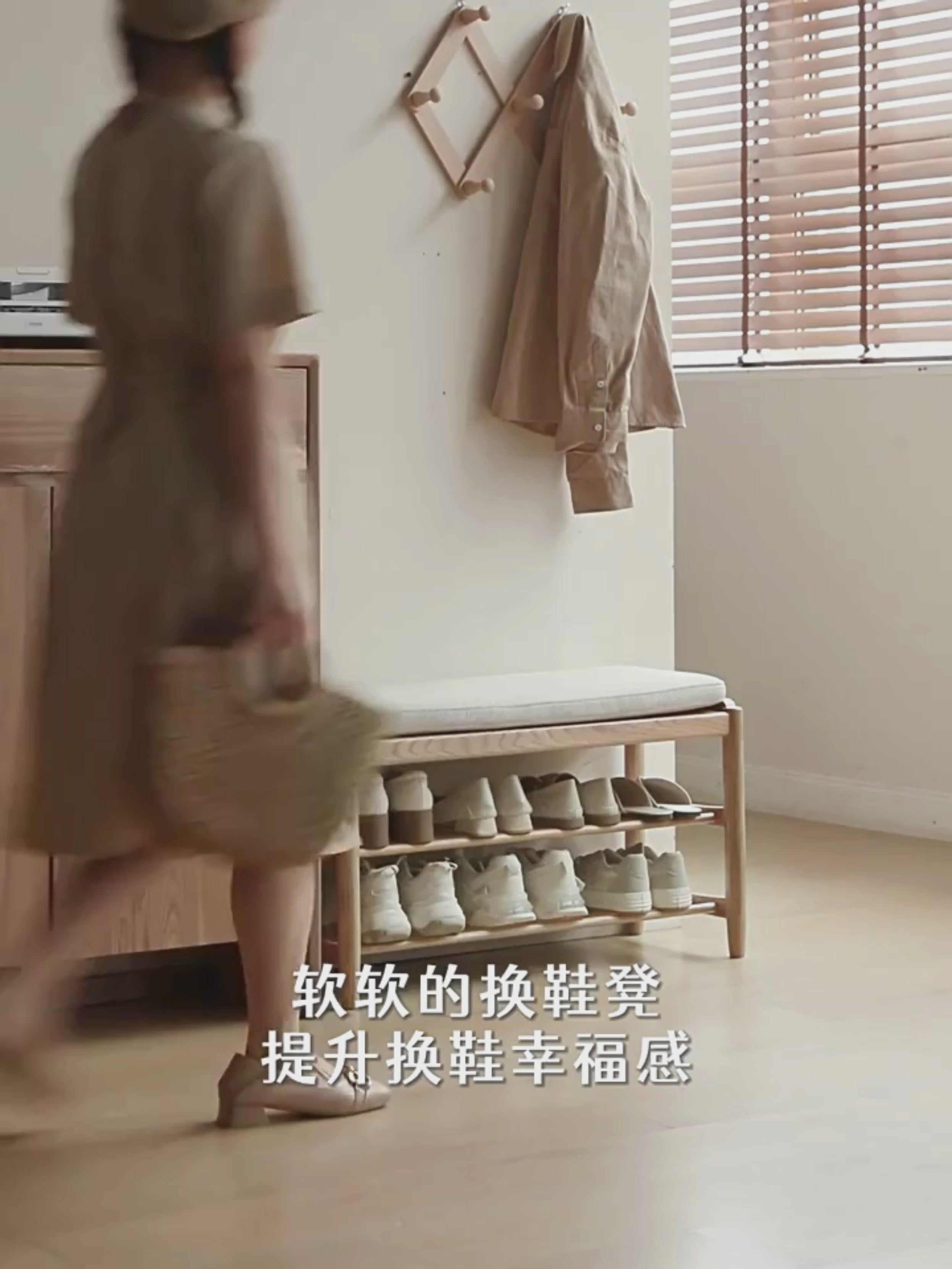 Small apartment salt porch with light color just right sponge cushion + double-layer shoe rack to meet daily practical needs, natural wood color with imitation cotton and linen fabric inadvertently reveals a sense of looseness