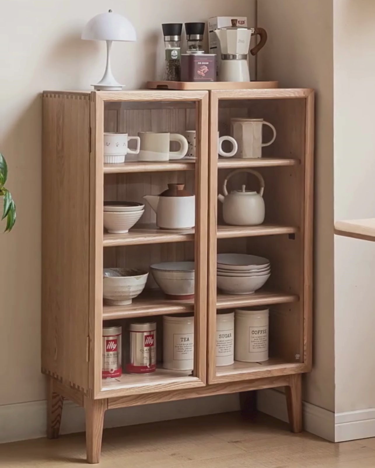 Imported Fraxinus mandshurica with fresh color, with tempered glass cabinet door, transparent and dustproof, better set off the texture of the utensils. A cabinet of multi-use, multi-scene storage. It is the beauty of the living room and the sideboard, Is the mini library of the study.... A small place, bring the ritual of life.