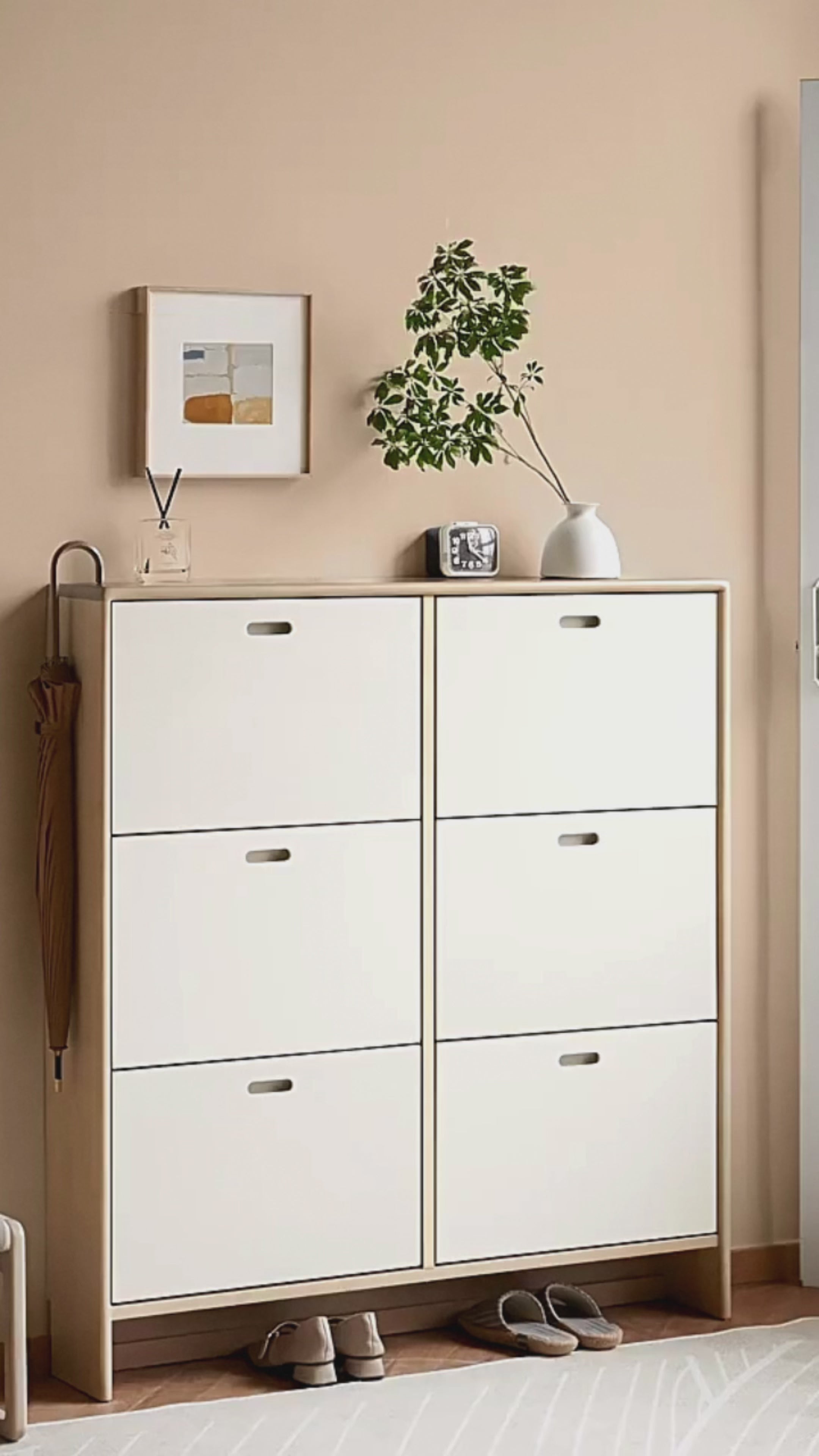 The total depth is only 20cm, the gospel of the narrow entrance! Warm white and log color matching show a fresh and lively atmosphere. It can hold up to 18 pairs of regular shoes. There are also single-row specifications available. Combination models are also good to meet different shoe storage needs.