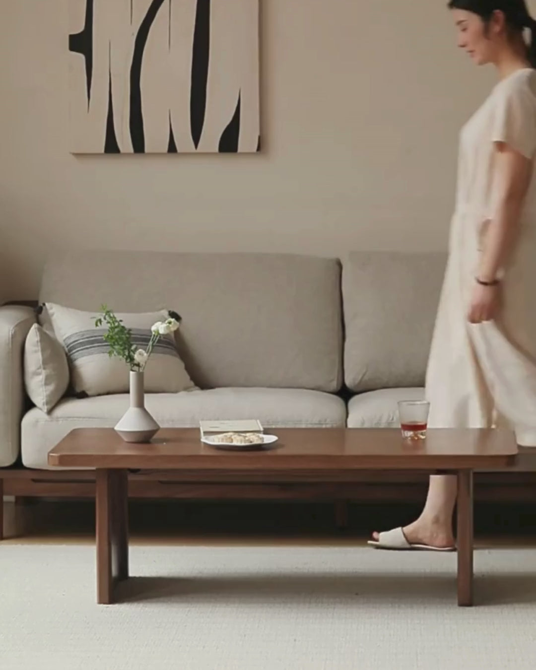 Simple and pure smooth lines, with full sense of design landing table legs. Calm and restrained yet light. The corners are rounded and polished, with round square in the middle, it gives it a softer architectural aesthetic. Selected imported Fraxinus mandshurica walnut color, elegant retro, texture such as water ripples. Thick and spacious table top, moderate height, as a tea table, can become a party elegant heaven and earth.